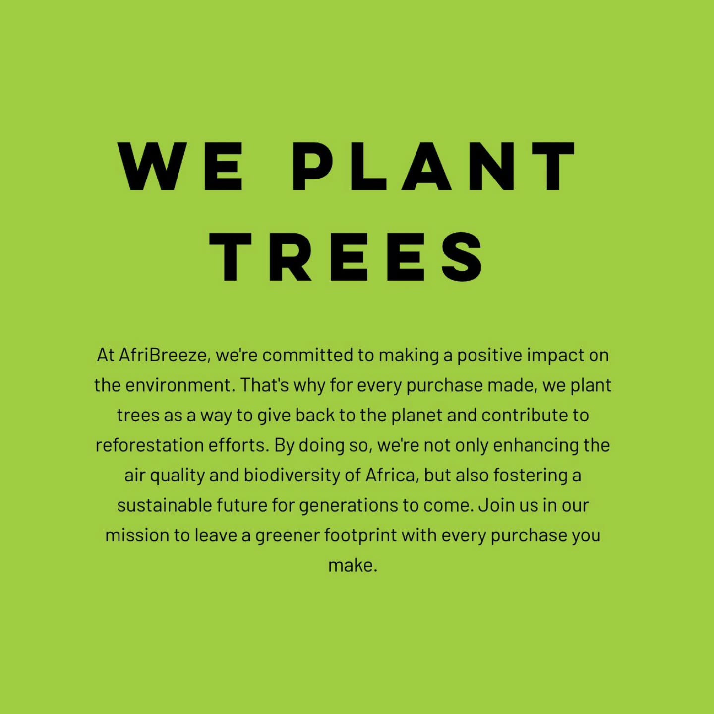 At AfriBreeze, we're committed to making a positive impact on the environment. That's why for every purchase made, you contribute to our Tree-Planting Initiative, helping to reforest and restore the landscapes we love. We plant trees as a way to give back to the planet and contribute to reforestation efforts. By doing so, we're not only enhancing the air quality and biodiversity of Africa, but also fostering a sustainable future for generations to come. Join us in our mission to leave a greener footprint with every purchase you make.